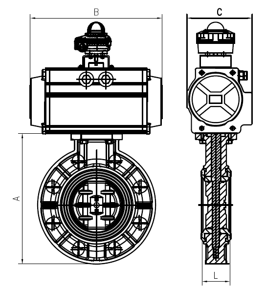 氣動塑料蝶閥外形尺寸圖: